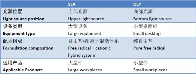 ● According to different equipment processes, mature UV curing 3D printing in the market is divided into SLA type and DLP type.